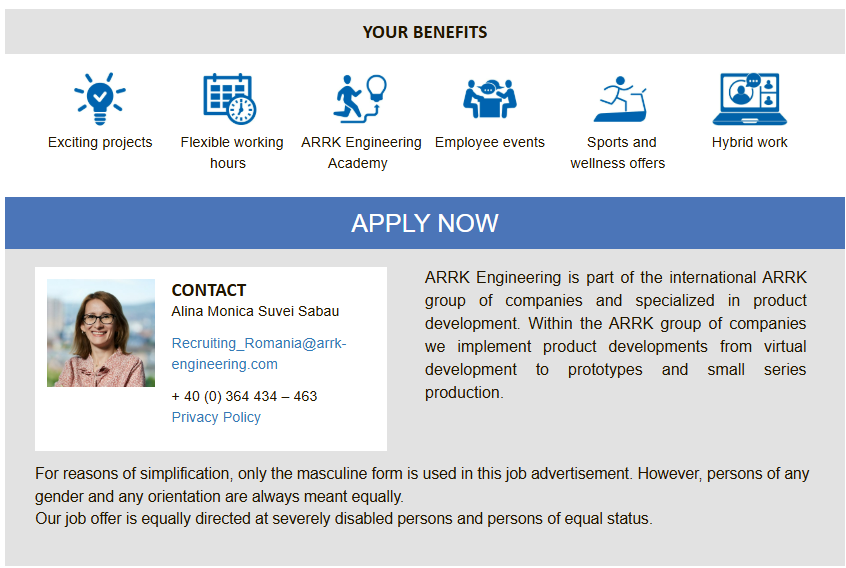 We would like to inform you that due to data protection, we can only accept your application via our online application platform. In order to be able to review your application, we would therefore ask you to apply on our careers page with just a few clicks: https://arrkeurope.onlyfy.jobs/job/fcjrnj7o